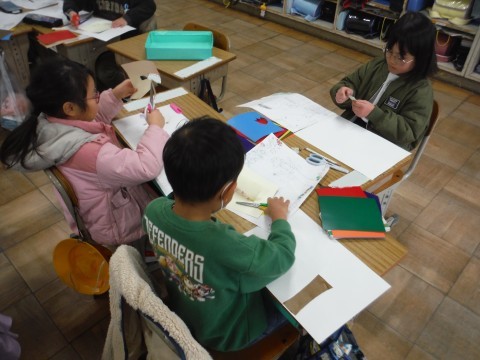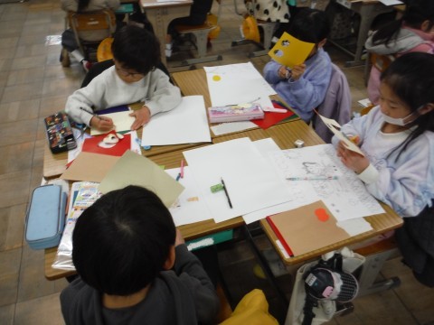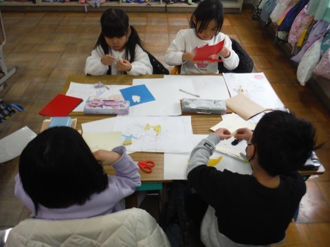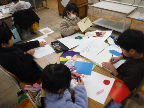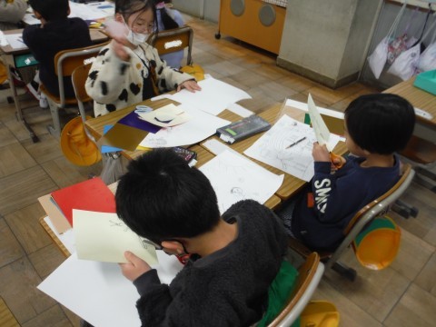 1月26日(月) 1年2組 公開日 2026/01/26 更新日 2026/01/26 1年生 図工の学習です。今日は,いよいよ版画の板づくりに挑戦です!1年生は「カラータックはんが」という方法で制作しています。色のついた紙を切って貼っていく方法です。ある程度大きさを見積もってから下書きをして貼り付けます。少しずつ完成に向かってきました☆ +2