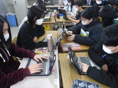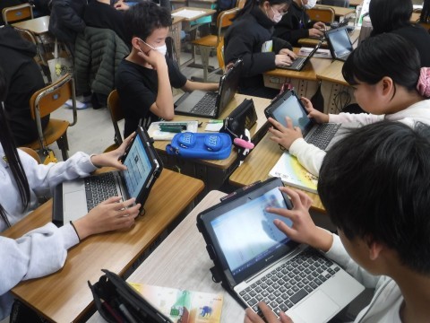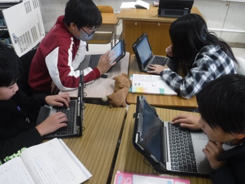 タブレットでそれぞれの意見を読み,コメントをしています。