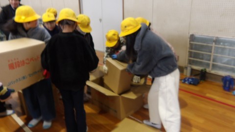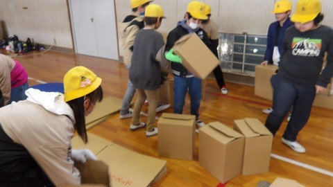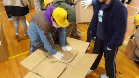 写真は段ボールベッドを協力して組み立て,座ったり寝転んだりしているところです。