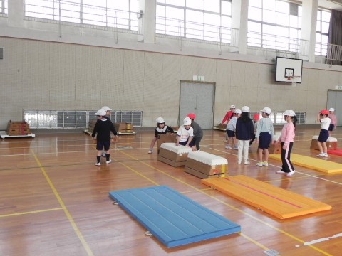 体育館で跳び箱やマットを用意していました。
