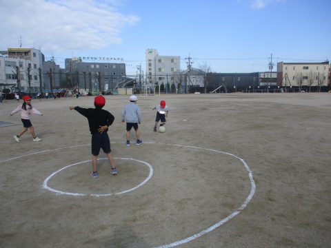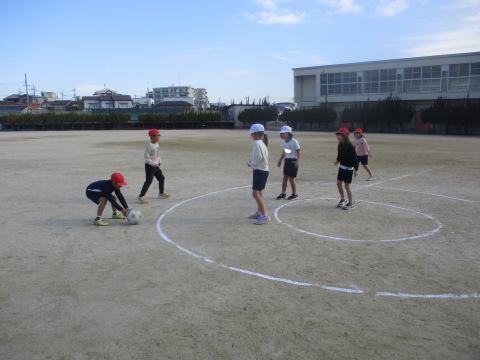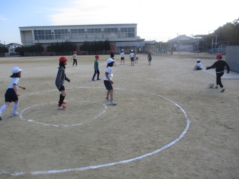 今日の体育では,キックサークルシュートゲームをしました!真ん中にいる味方がボールを取れるようにするのが難しかったです・・・