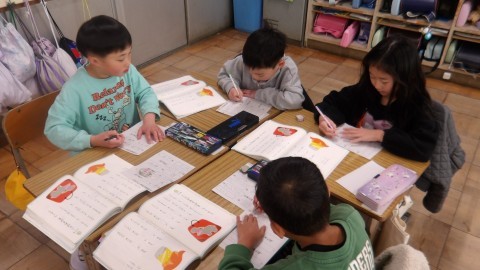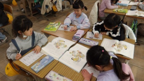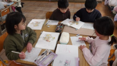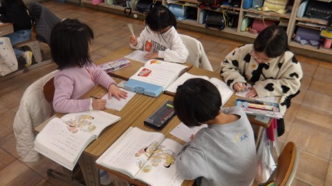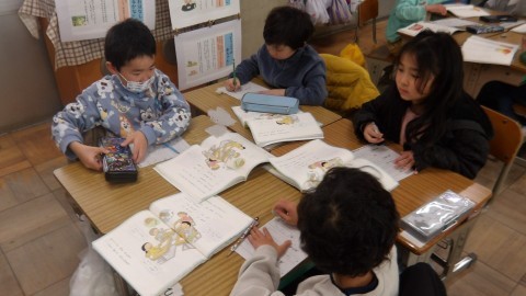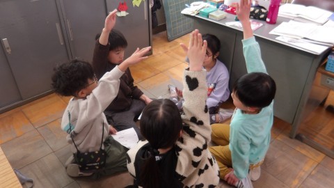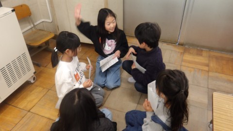 国語「ことばあそびをつくろう」の学習です。今日は,班でことばあそびの問題を作りました。その後,別の班の子たちと集まって,問題を出し合いました!いろいろなことばを考えることができました!!