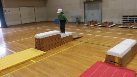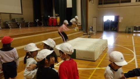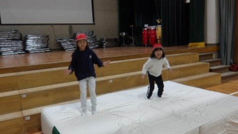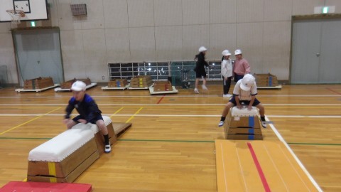 体育「とびばこ」の学習です。今日も前回に引き続き,カンガルー跳びや,馬に乗る感じの運動をしました。加えて,大きなマットをだして,さるのように高いところから跳びおりる運動もしました。跳ぶ感覚や,腕に力を加える感覚を味わいながら,楽しんで運動することができました!!準備や片付けも協力してできるようになっています☆
