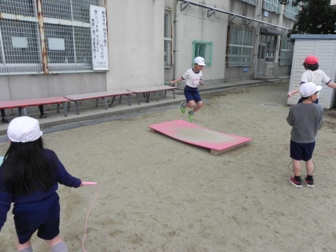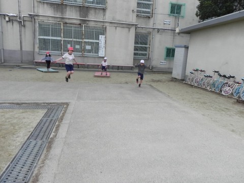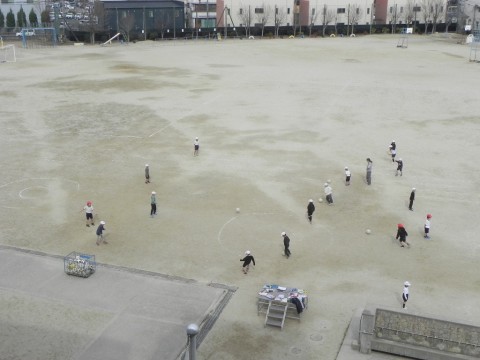 縄跳びをしたあと,サッカーボールでパス交換をしていました。