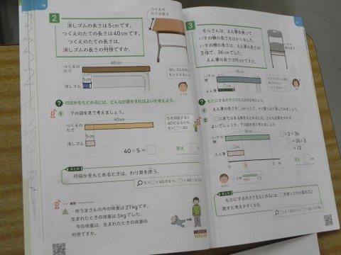 机の長さは,消しゴムの長さの何倍になっているのか,