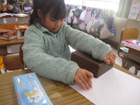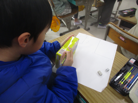 算数では,はこの形の学習に入りました!今日は持ってきた箱の面をすべて紙に写し取りました♬ここから先は何をするのでしょうか?!