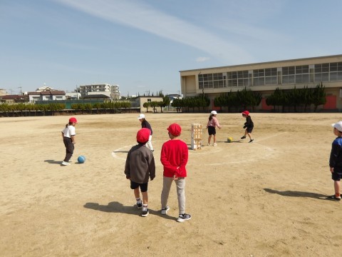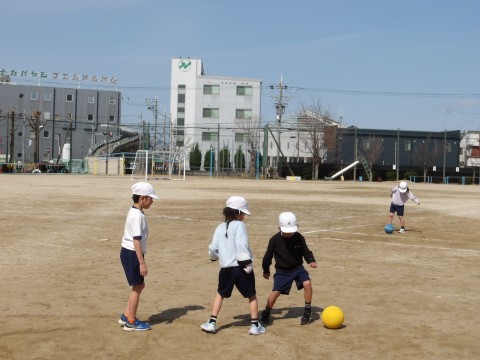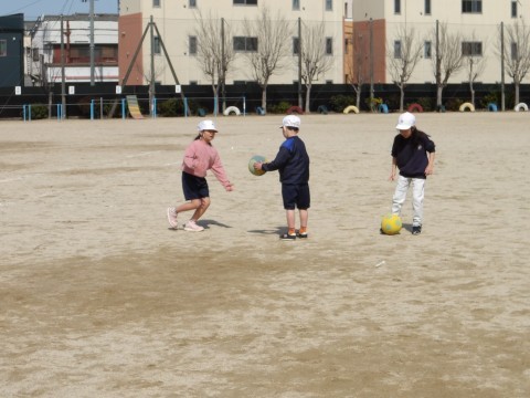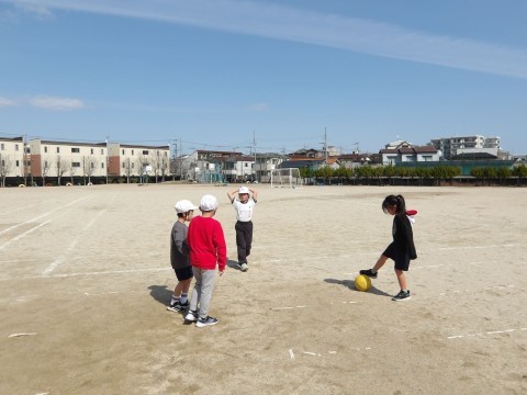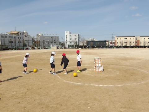 体育「キックサークルまとあてゲーム」の学習です。2学期にやった「サークルまとあてゲーム」のキックバージョンです。今日は新しいチームを編成し,チームで練習をしました。ボールを蹴る経験が初めての子もいたので,まずは蹴る練習から始めました。的にあてて,箱を倒せるといいなと思います☆
