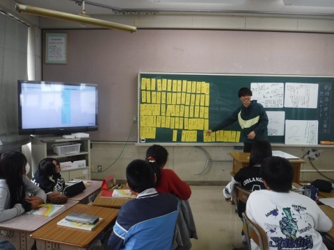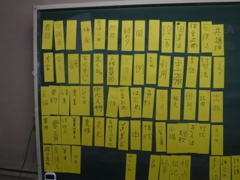 子どもたちが洗い出した「国語で使う言葉」が黄色のカードに書き出され、黒板いっぱいに掲示されていました。