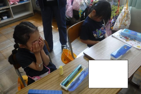 1年生は,給食をおいしく食べたり,図書に行ったり,算数でブロック数クイズをしたりしました。