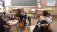 外国語活動です。今日は、英語で自己紹介を行うために、タブレットを使い、調べ学習を行っていました。