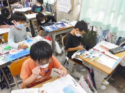 絵の具を使って色を塗っています。海の色や、空の色をていねいに塗っていました。