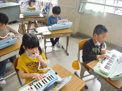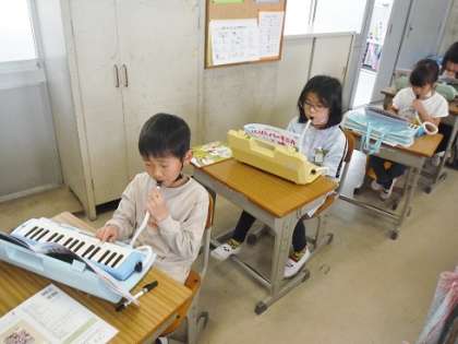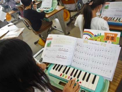 鍵盤ハーモニカで「すいかの名産地」を練習していました。