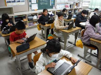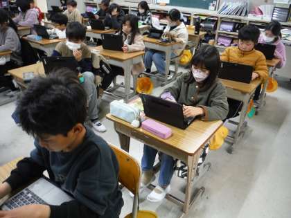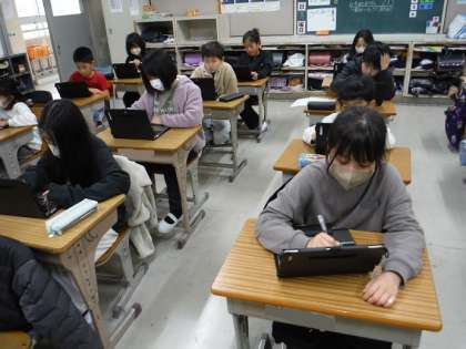 わたしたちの学校じまんを発表します。原稿をタブレットを使ってまとめていました。