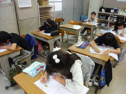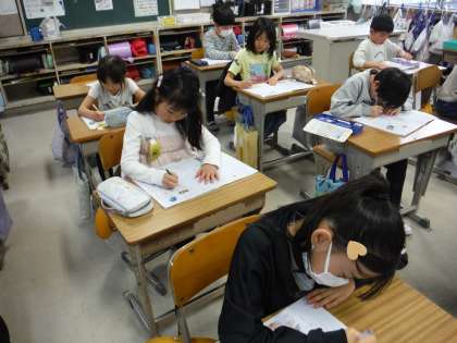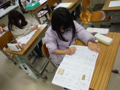 新出漢字の学習です。今日は「計」と「弱」です。ていねいに練習していました。