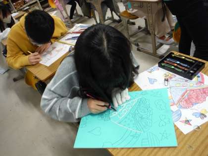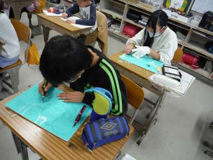 版画に取り組んでいます。下描きが終わった人から、彫刻刀での作業に取りかかっています。