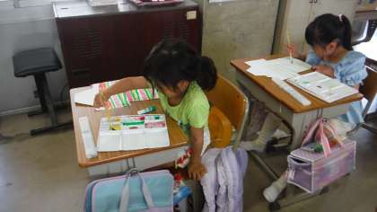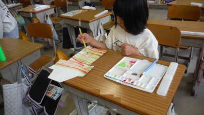 図工の学習の様子です。「しましまもようのシャツ」をテーマに、絵具で色塗りをしていました。