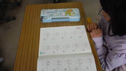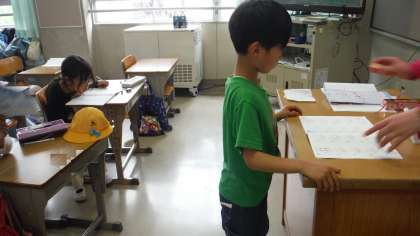 算数の学習の様子です。先生にチェックしてもらって、できた人はノートにハンコを押してもらっていました。