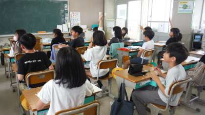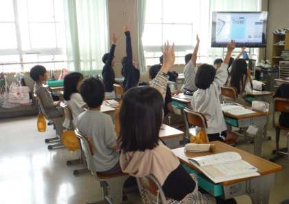 算数の学習の様子です。先生の質問に対して、たくさんの人が手を挙げていました。指先まできれいに手を伸ばして手を挙げていました。