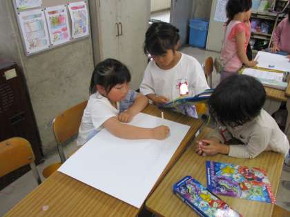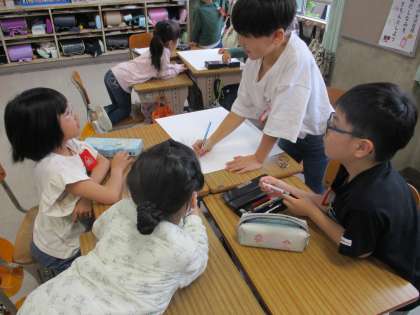 生活の学習です。インタビューしたことをもとに、掲示物を作っています。