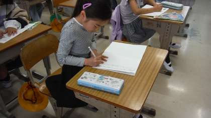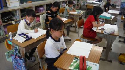 国語の学習の様子です。『そうぞうしたことを伝え合おう』で、グループで読み合いをしてほめほめカードをわたす活動をします。