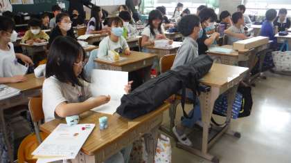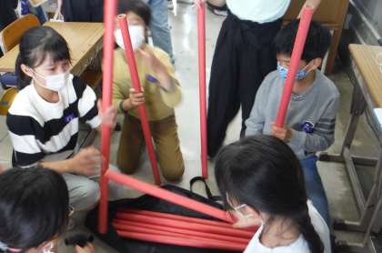 算数の学習の様子です。「1㎥」を体感してみようということで、グループに分かれて棒で1㎥を組み立てていました。