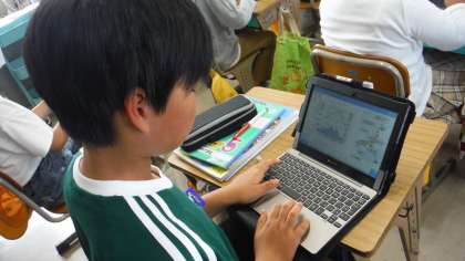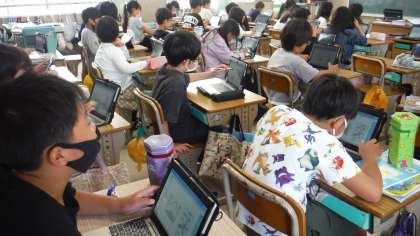 社会の学習の様子です。先生がタブレットに配信した発表ノートを見て、気温と降水量のグラフから、どこの都市かを感がていました。