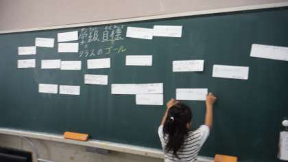 学級会の様子です。学級目標を一人一人が考えて、それを黒板に貼っていきました。みんなの思いを学級目標に掲げ、ゴールをめざしてがんばってほしいと思います。