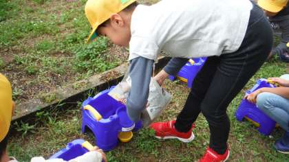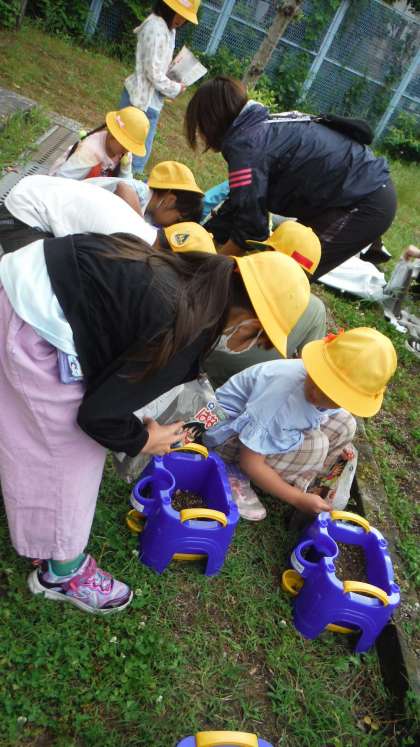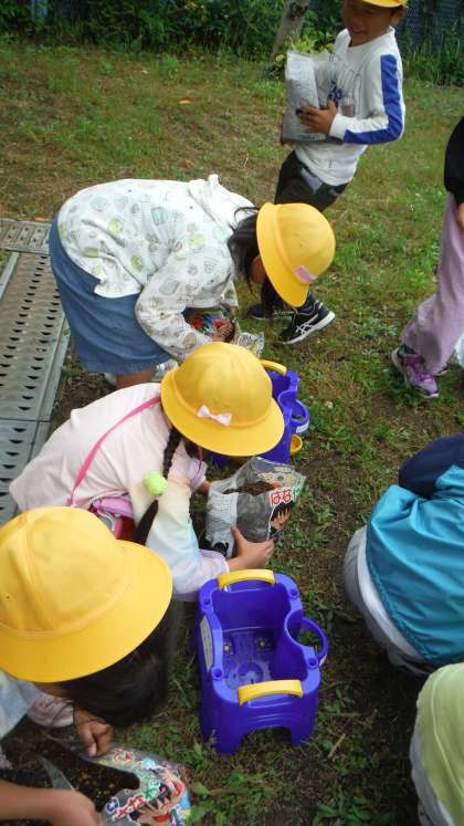 生活の学習の様子です。植木鉢に土を入れて、アサガオの種を植える準備をしていました。
