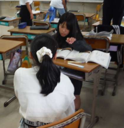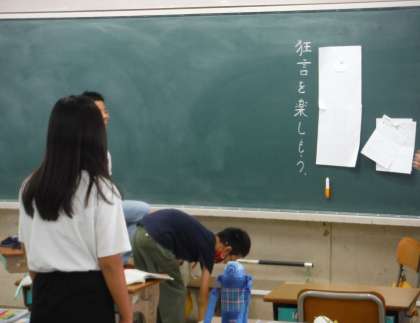国語の学習の様子です。狂言「柿山伏」をどのように表現するかをグループごとに考え、練習していました。