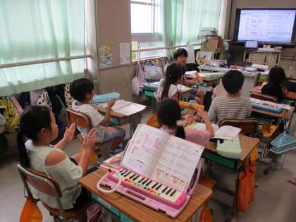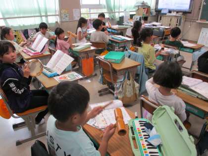 音楽の学習です。リズムに合わせて楽器を演奏します。カスタネット、タンブリン、すず、トライアングル、ウッドブックを使って練習しました。