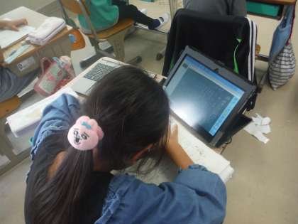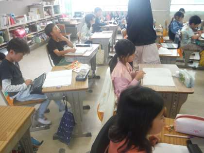 国語の学習の様子です。『秋』をテーマに詩を書いていました。秋を表す言葉を黒板にまとめた写真を参考に書いている人もいました。