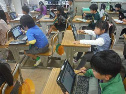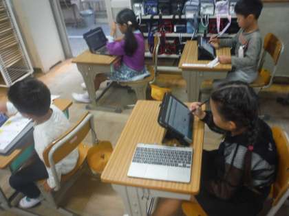 算数の学習の様子です。タブレットのドリルパークで漢字の練習をしていました。
