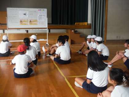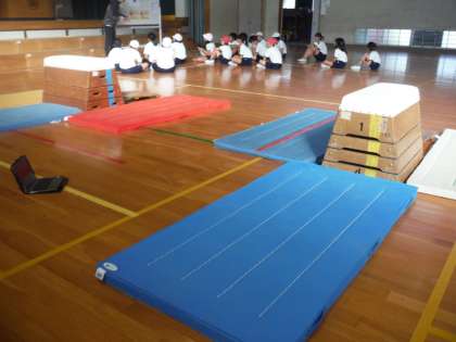 体育の学習の様子です。かかえ込み跳びのポイントをグループやみんなで考えながら練習に取り組んでいました。