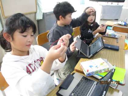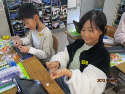 理科の時間の様子です。乾電池と豆電球をどうつなげば電気がつくか実験をしました。