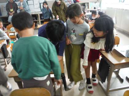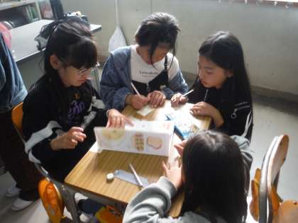 国語の学習の様子です。『姿を変える○○を交流しよう』をめあてに、それぞれが作ったびっくりたまて箱を見て感想を書き合っていました。