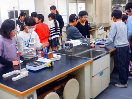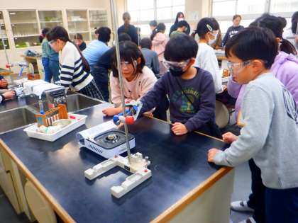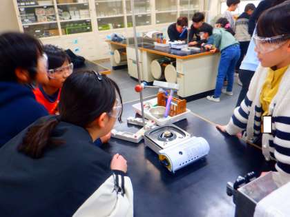 理科の授業の様子です。今日は、水の温まり方の実験をしました。安全眼鏡をつけて、班のグループのみんなで協力して実験装置をセットしました。まずは、試験の下の方から水を温めると、色が変化しました。しっかり観察しました!!