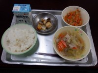 ドライカレー、レタスと卵のスープ、牛乳です。「カレーの辛さは大丈夫だけど、ワサビの辛さは無理。」という声がありました。みんなカレーは大好きなメニューです。
