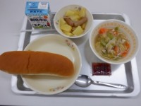 ナポリタンスパゲティ、夏野菜とツナのマヨネーズ風焼き、ミニコッペパン、牛乳です。ナポリタンスパゲティは人気があり、増やしてもらう児童がたくさんいました。