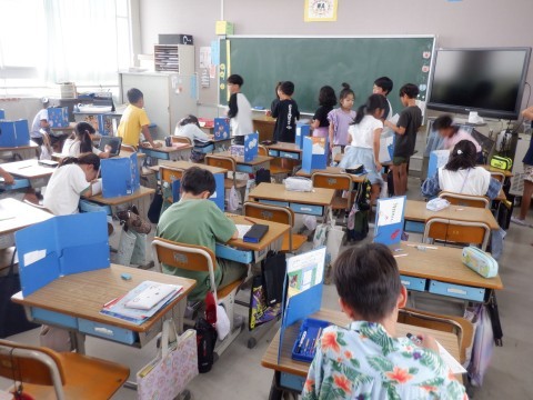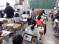 この時間はテストを行っています。国語、社会のテストです。みんな一生懸命に頑張りました。