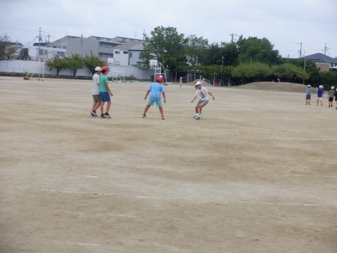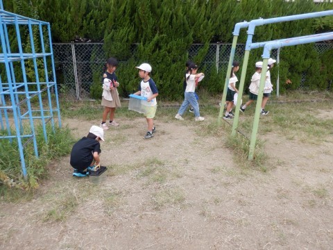 グラウンドに出てたくさんの児童が遊んでいます。サッカーやドッジボールで遊んだり、鬼ごっこで走り回ったり、遊具で遊んだりです。このところ虫取りをする児童が増えてきました。みんなそれぞれに楽しんでいます。