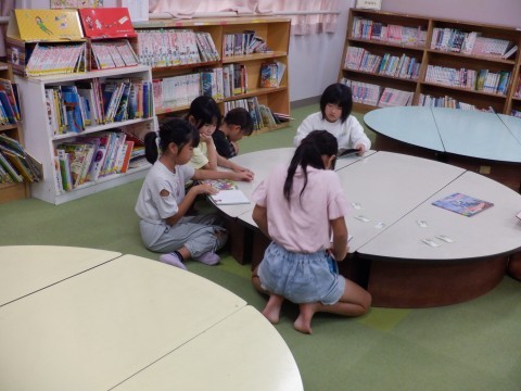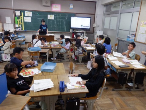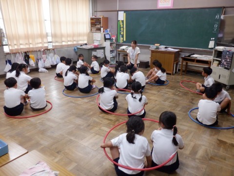図書、国語、体育の授業です。体育は、グラウンドで一輪車、フラフープなどをする予定でしたが、あいにくの雨でグラウンドが使えなくなったので教室でフラフープのみを練習しました。全員ではできないので順番に交代で行いました。回すのはなかなか難しいようです。