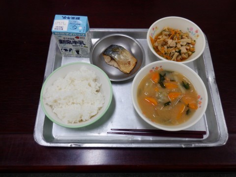 焼きサバ、まぜたら秋の風味ごはん、野菜たっぷりみそ汁、ごはん、牛乳です。まぜたら秋の風味ごはんは、きのこやクリが入った秋の風味たっぷりのごはんになりました。
