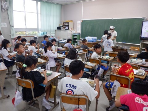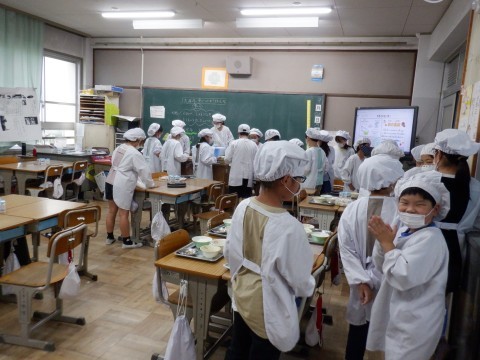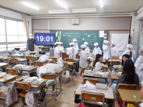 給食の係が中心に準備を進めてくれています。早いクラスはもう「いただきます。」をしました。4年生も準備はスピーディです。