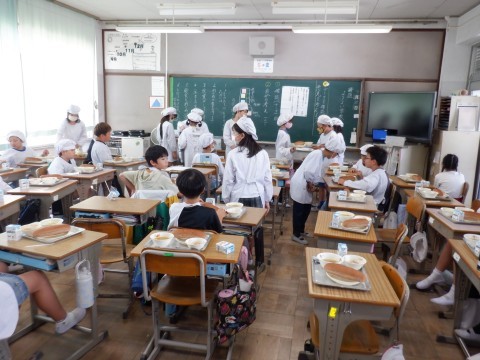 みんなで準備をしています。係も手際よくよそいでいきます。もうすぐ「いただきます」です。みんなでおいしくいただきましょう。