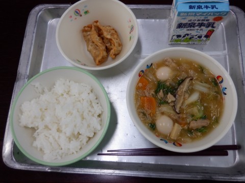 八宝菜、揚げギョーザ、ごはん、牛乳です。今日は中華メニューです。児童たちにも普段から食べなれているメニューです。とても好評でした。