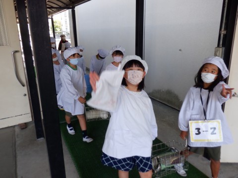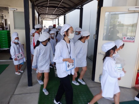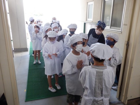 係の児童がクラスごとに取りに来ています。みんなで「いただきます。」と感謝の気持ちを言ってから取りに入ります。いつもありがとうございます。