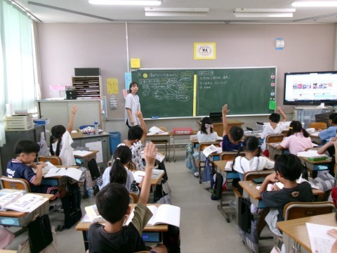 社会と体育の様子です。社会では,前の時間に自分で調べた消防士の1日について発表していました。「前に勉強した,警察官と同じところがある」という声もきこえました。