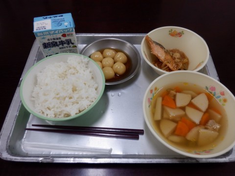 鮭のきのこソースかけ、月見汁、みたらし団子、ごはん、牛乳です。今日は月見メニューです。月見汁にはさといもが入って秋の気分が上がります。みたらし団子も好評でした。