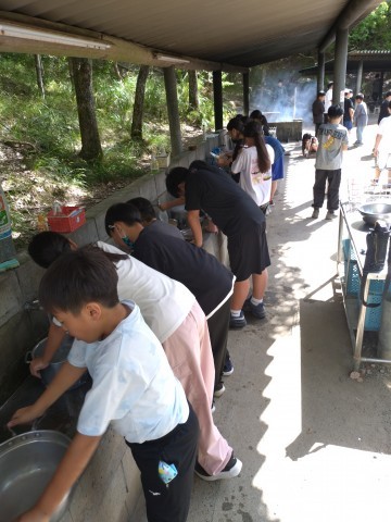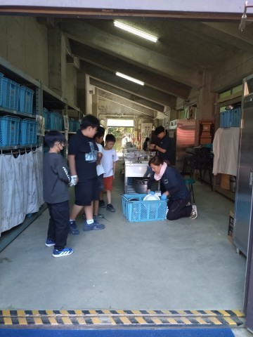 後片付けの様子です。「鍋もボールも、白鷺小学校さんにお貸しする前より綺麗です。鍋の縁まで、ピカピカで凄いです」と褒めていただきました。褒められた子どもたちも、大喜びでした。