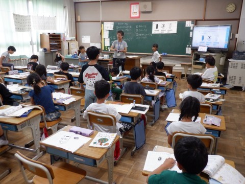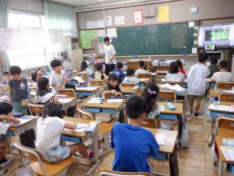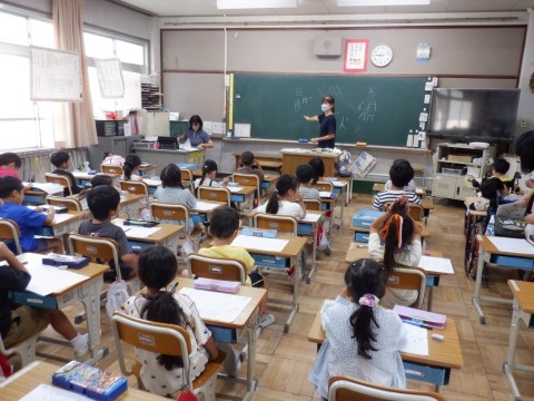 書写、国語、算数の授業の様子です。書写は、漢字の書き方です。見た目に美しく書くにはどこを気をつければよいか説明をしています。1年生の漢字は基本的な漢字が多く、これから習う難しい漢字でもそれらの組み合わせというところが多いので、しっかり身につけておくと将来とても役に立ちます。頑張りましょう。